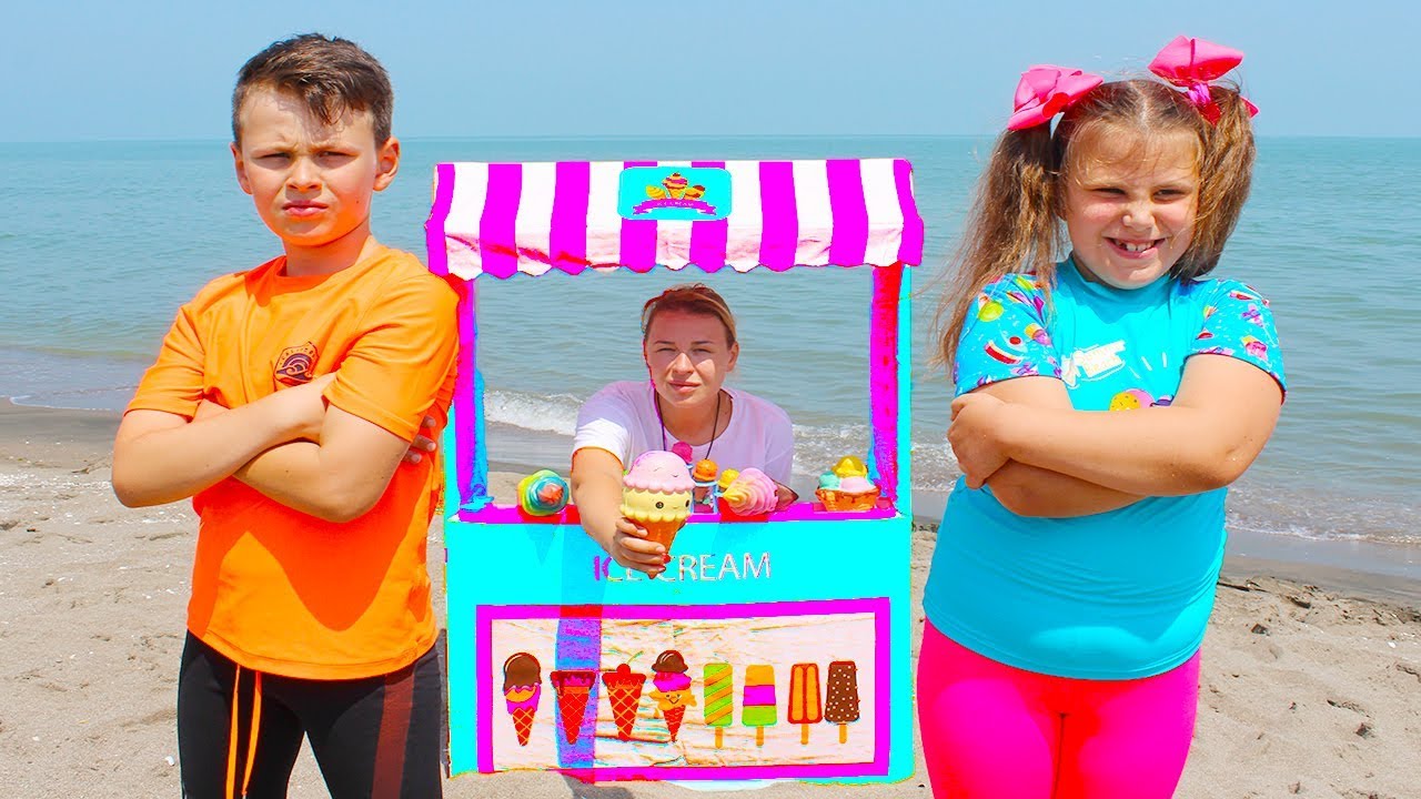 Ali and Adriana play in ice cream shop on the beach with mama. Ali and Adriana want the same ice cream. Mama staged competition for kids. Funny video about ice cream toys and friendship.